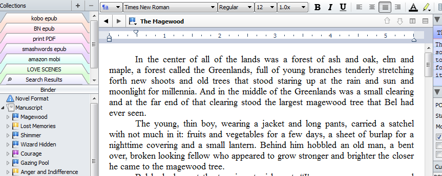 For the last five or so books, I've switched to Scrivener, and it has changed my writing tremendously. As you can see in the screen shot, it allows for color coding of chapters, outlining and index carding. All of my books from Gabriella and the Curse of the Black Spot on were written in Scrivener. I am fairly shocked at how much faster I'm writing using it since everything is all in one place from the outlines, notes, plot summaries, character summaries and even pictures. Once the book is written, I compile the file and export it to epub and edit the HTML and CSS by hand using Sigil.